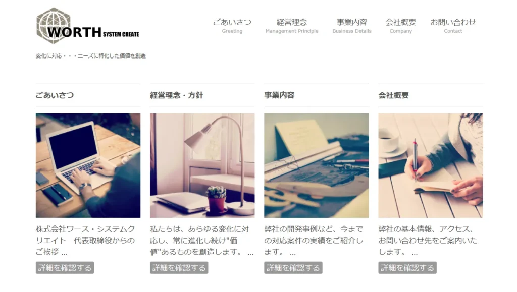 装飾を削ぎ落とし、余白を活かしたミニマルなデザインを採用。落ち着きのあるセピアカラーをアクセントに添えることで、システム開発会社としての「誠実さ」と、無機質にならない「人間味のある信頼感」を両立させました。